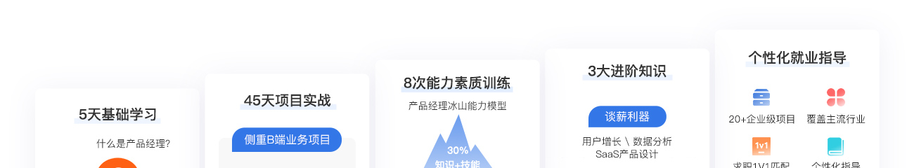 課程內容面向不同背景的學員成功轉型產品經理,從事互聯網行業,成為企業核心人才的人群,通過六步進階訓練,掌握產品經理必備技能;產品的課程通過常用產品工具、產品思維及專業技能提升,進階為項目需求調研、業務流程梳理、完成個性化項目實戰、再通過運營數據分析能力培養,覆蓋C/B端行業的不同領域互聯網產品經理所必需的的中級產品經理專業課程。